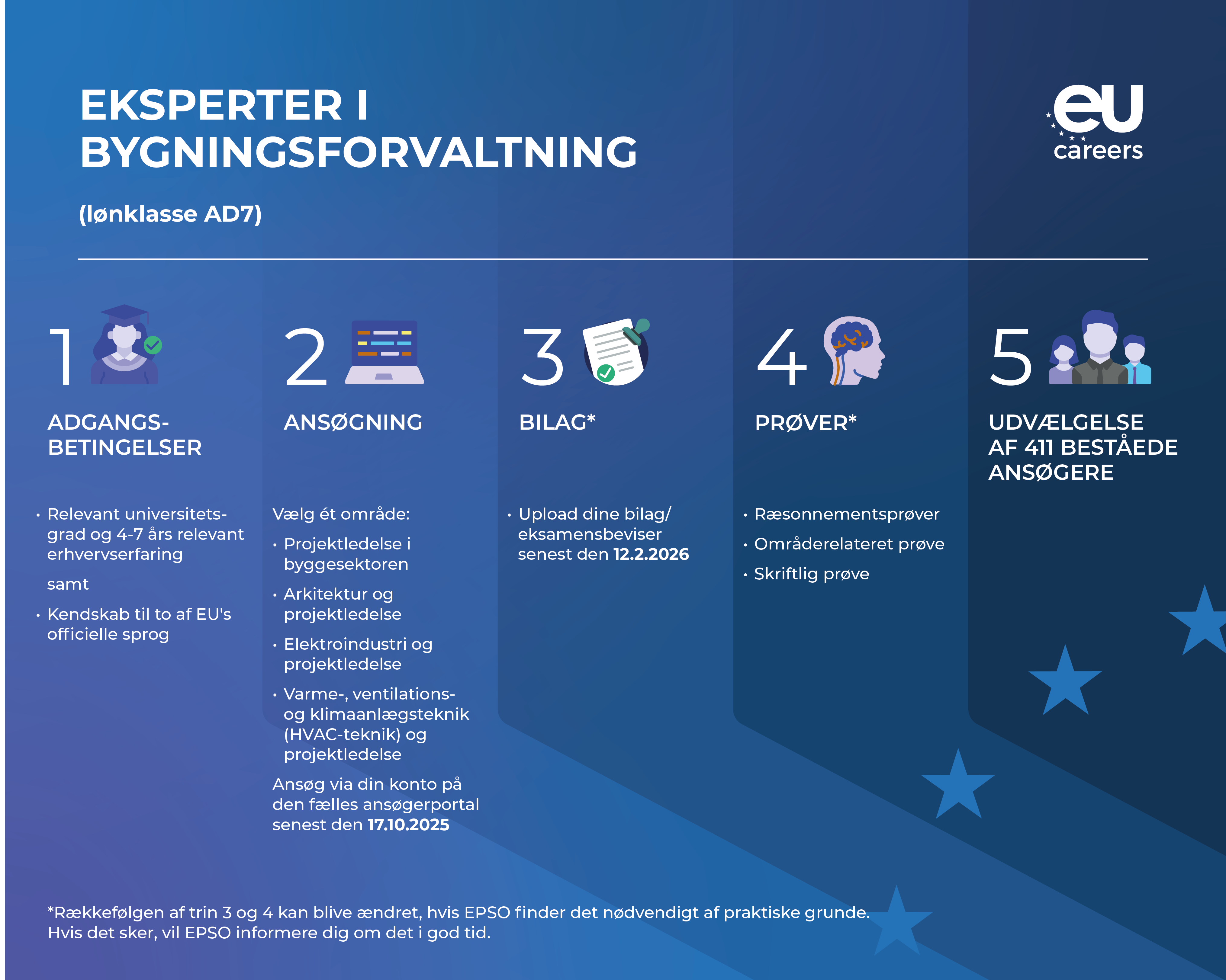 EU-institutionerne søger fagfolk inden for fire områder: projektledelse i byggesektoren, arkitektur- og projektledelse, elektroindustri og projektledelse samt varme-, ventilations- og klimaanlægsteknik (HVAC-teknik) og projektledelse. Ansøgere kan kun indgive ansøgning til ét af disse områder, og de udvalgte ansøgere vil blive ansat som administratorer i lønklasse AD 7.