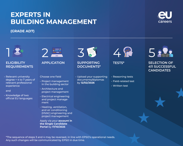 The EU institutions are looking for professionals in four fields: project management in the building sector, architecture and project management, electrical engineering and project management, as well as heating, ventilation, and air conditioning (HVAC) engineering and project management. Candidates may apply for only one of these fields, and successful applicants will be recruited as administrators at grade AD 7.