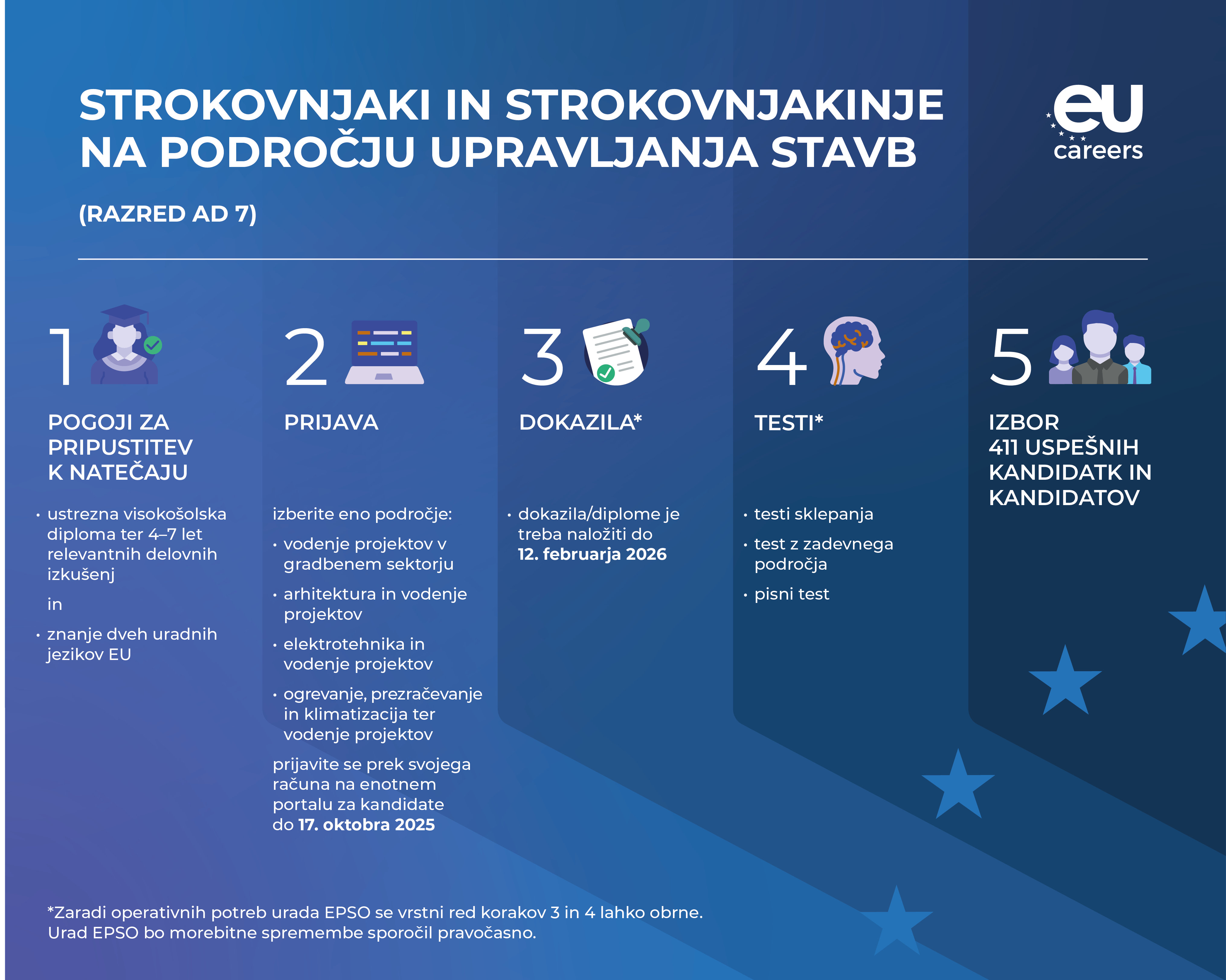 Institucije EU iščejo strokovnjake in strokovnjakinje na štirih področjih: vodenje projektov v stavbnem sektorju, arhitektura in vodenje projektov, elektrotehnika in vodenje projektov ter ogrevanje, prezračevanje in klimatizacija ter vodenje projektov. Prijaviti se je mogoče samo za eno od teh področij, uspešni kandidati in kandidatke pa se bodo zaposlili kot upravni uslužbenci oziroma uslužbenke v razredu AD 7.
